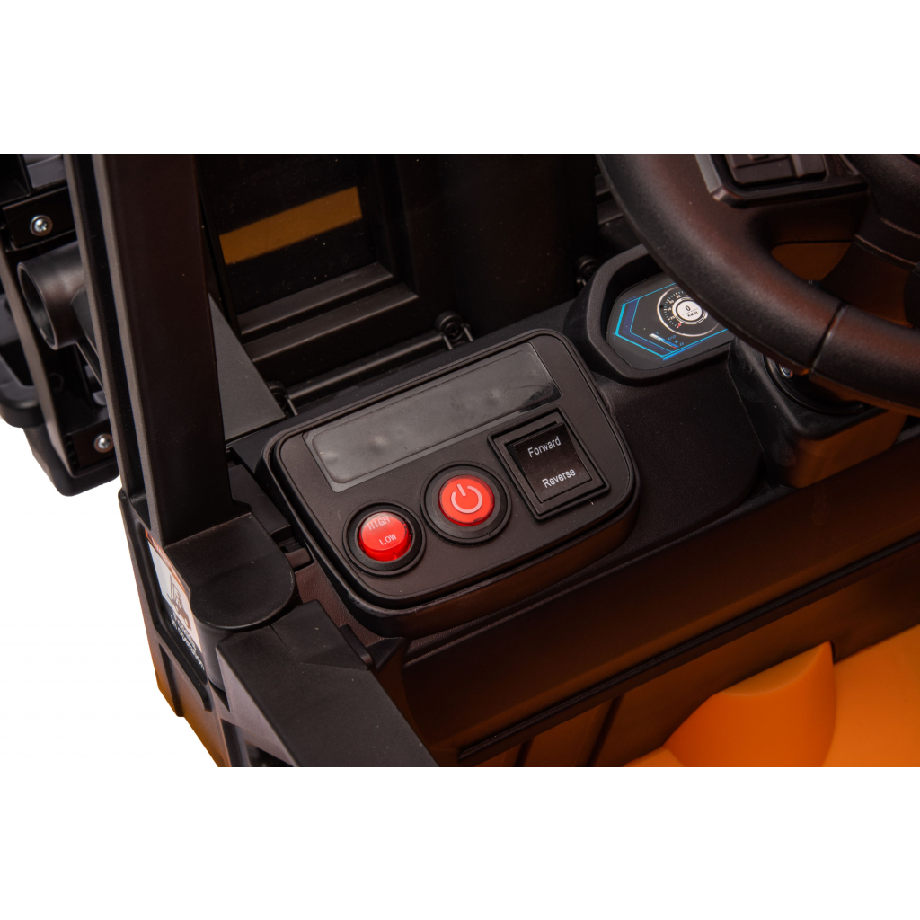 Daca copilul dumneavoastra nu poate ajunge la pedala de picior sau daca are nevoie doar de o mâna de ajutor, puteti prelua controlul cu telecomanda wireless pe deplin functionala. Telecomanda va ofera controlul complet al directiei, precum si a modului de deplasare înainte si înapoi. Tot din telecomanda puteti ridica sau cobori furcile. Telecomanda este de tip 2.4G, ceea ce semnifica faptul ca ea nu va interfera cu alte masinute